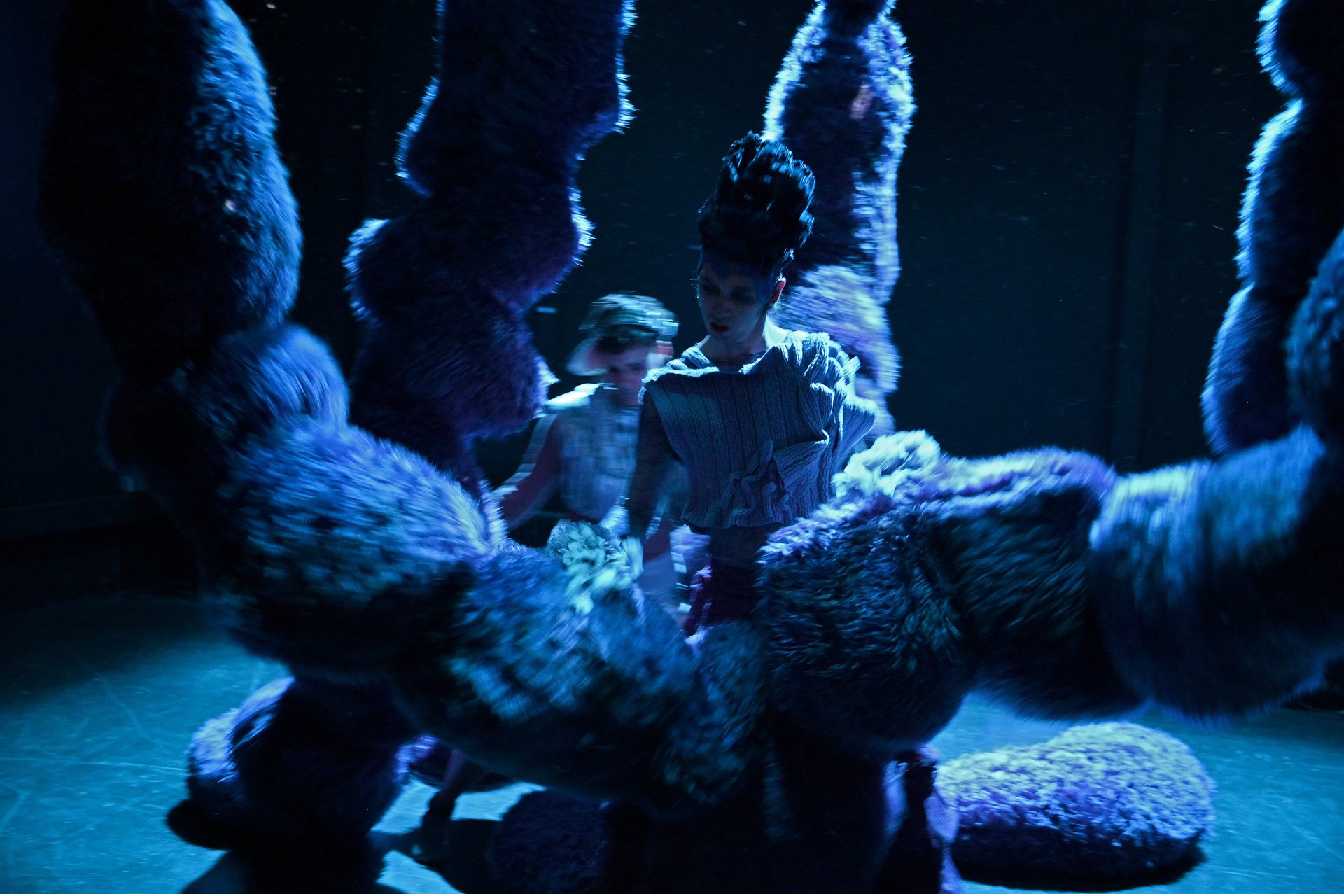 Die Inszenierung von Merle Zurawski zeigt, wie auch die Umwelt des Figurentrios unter dem Einfluss der Menschen leidet: Verschmutzung, Überfischung, Lärmbelästigung. Mit ihrer Parole: „Die wollen Me(eh)r, immer, immer mehr. Wir wollen Me(eh)r, unser Meer zurück!“, sagen sie den Menschen an Land gemeinsam den Kampf an. (…) Neben klassischem Wellenrauschen wird das Publikum in elektronisch selbsterzeugten Tiefseeklängen gewogen. Die herabhängenden und zugleich beweglichen lilafarbenen Plüsch-Tentakel erweisen sich als Multifunktionswaffe: Korallenriff, Nymphen-Felsen, Trennlinie zwischen Wasser und Land.