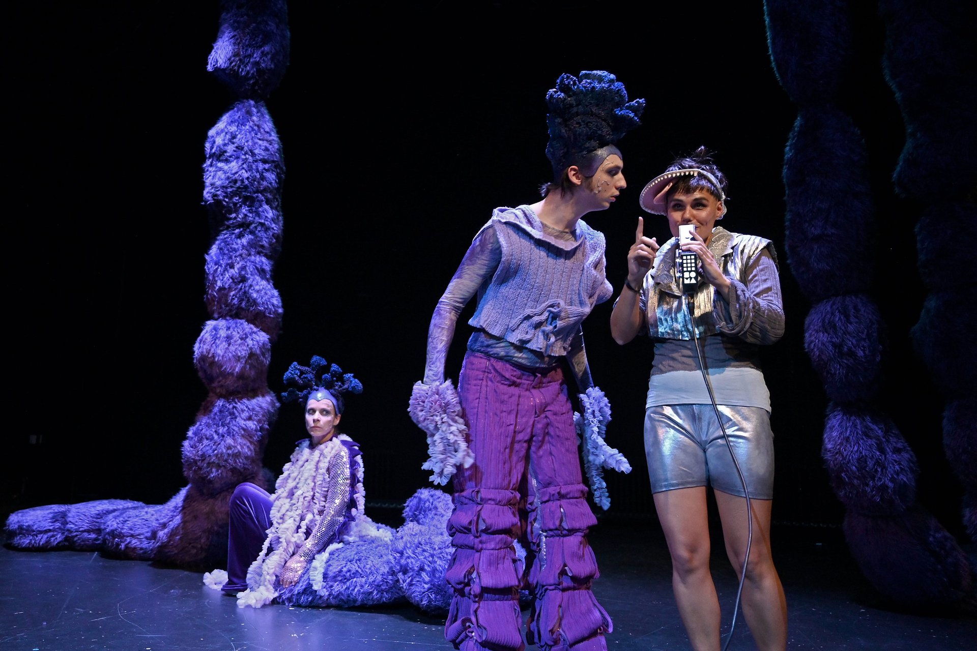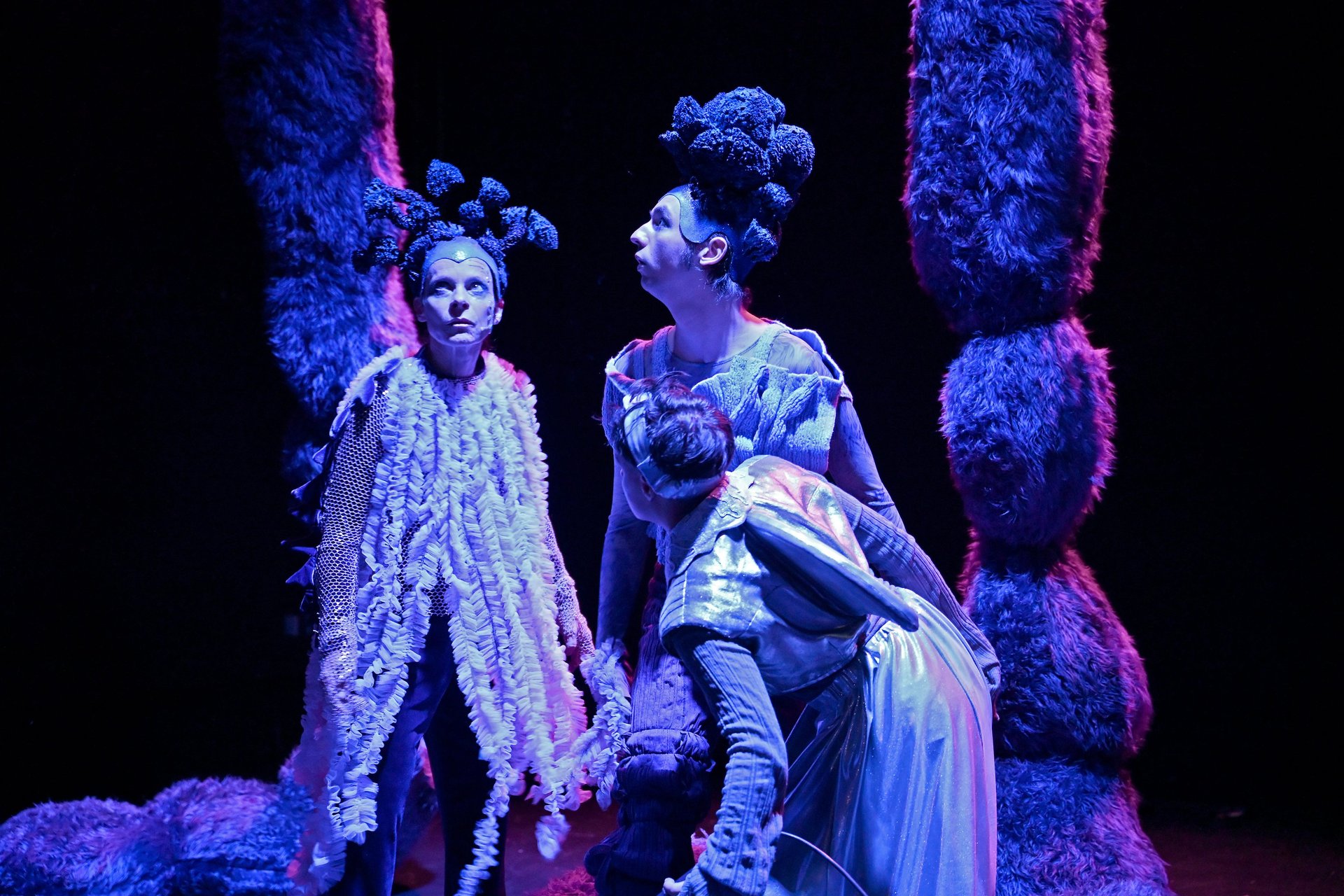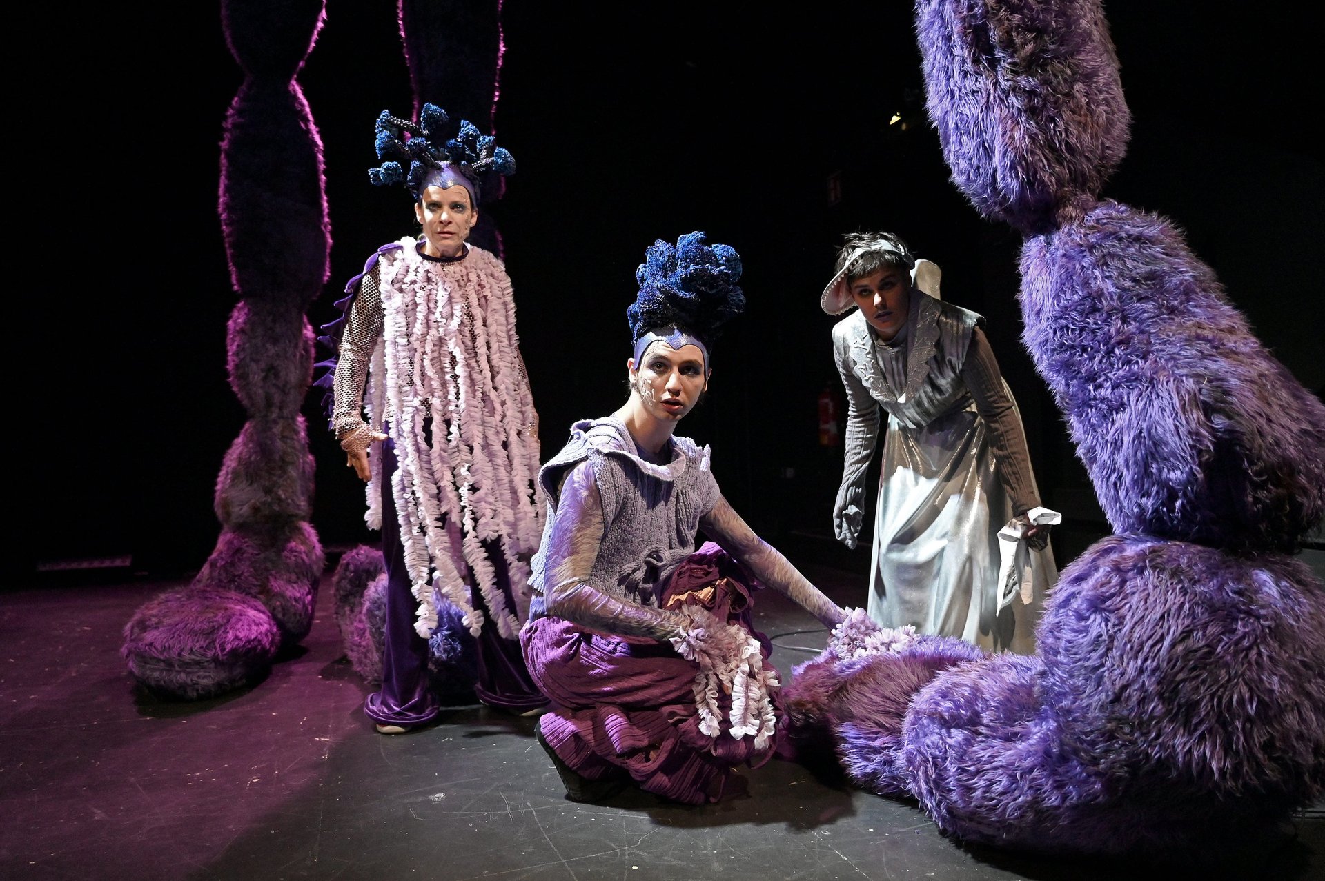 Die Inszenierung von Merle Zurawski zeigt, wie auch die Umwelt des Figurentrios unter dem Einfluss der Menschen leidet: Verschmutzung, Überfischung, Lärmbelästigung. Mit ihrer Parole: „Die wollen Me(eh)r, immer, immer mehr. Wir wollen Me(eh)r, unser Meer zurück!“, sagen sie den Menschen an Land gemeinsam den Kampf an. (…) Neben klassischem Wellenrauschen wird das Publikum in elektronisch selbsterzeugten Tiefseeklängen gewogen. Die herabhängenden und zugleich beweglichen lilafarbenen Plüsch-Tentakel erweisen sich als Multifunktionswaffe: Korallenriff, Nymphen-Felsen, Trennlinie zwischen Wasser und Land.