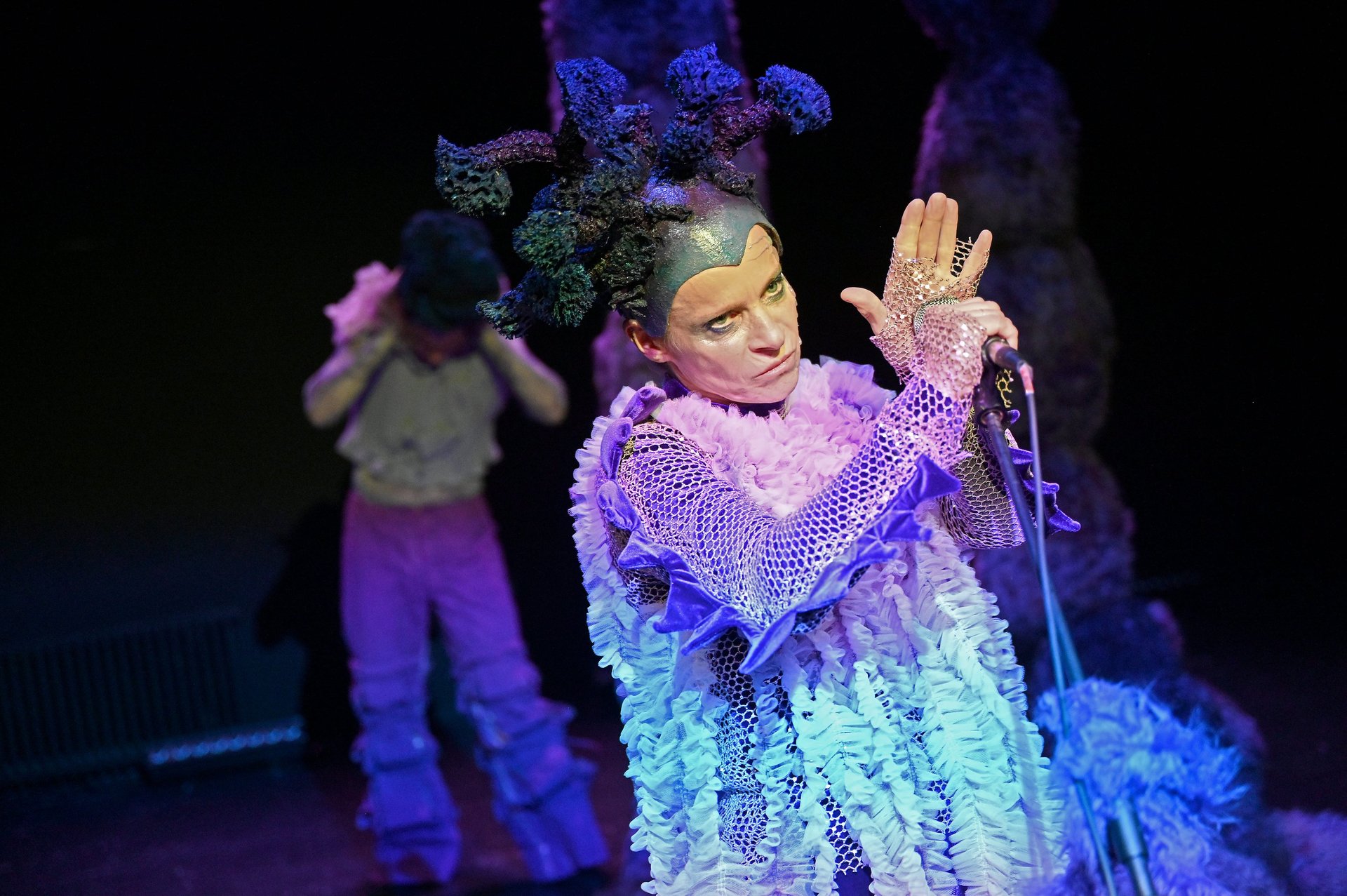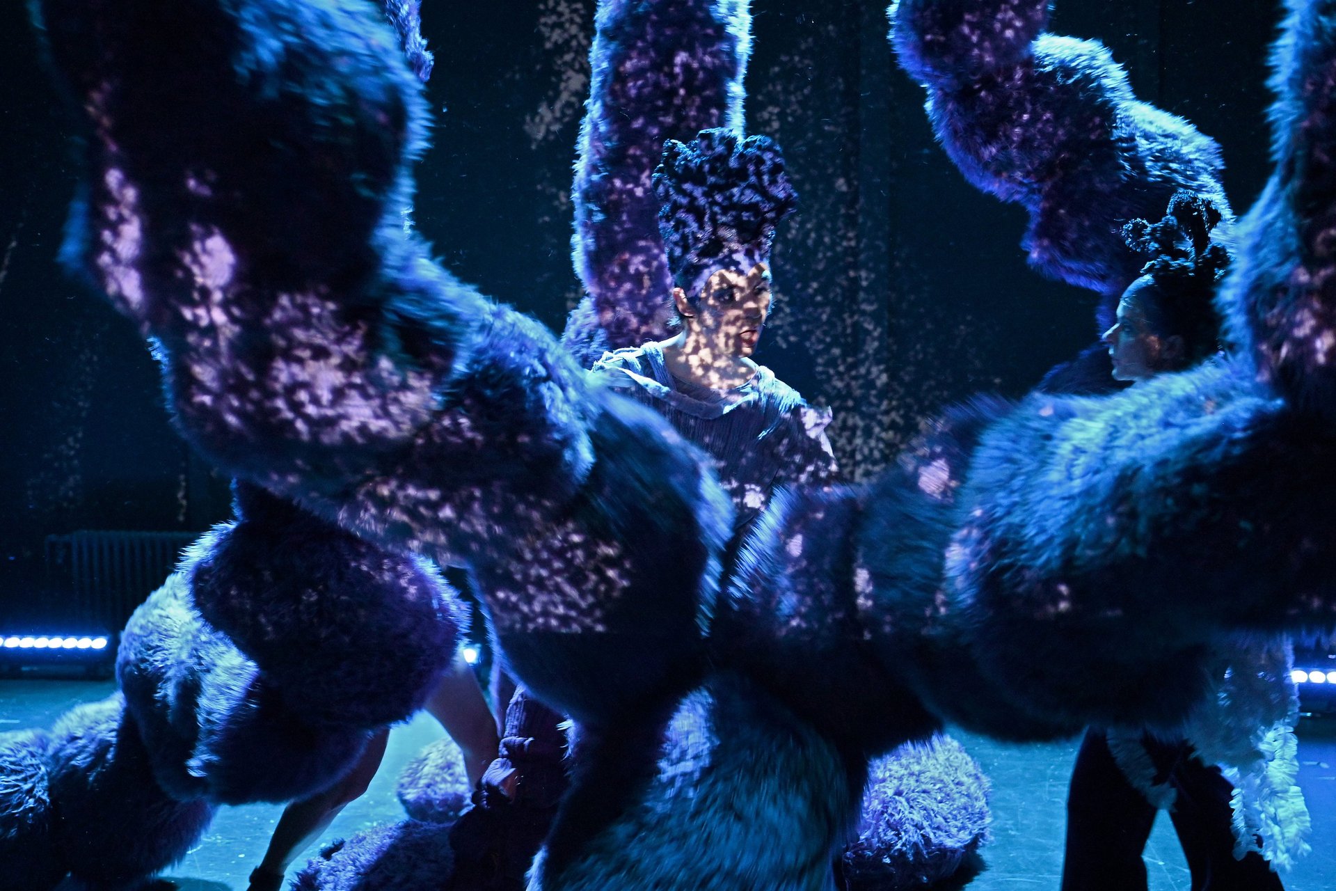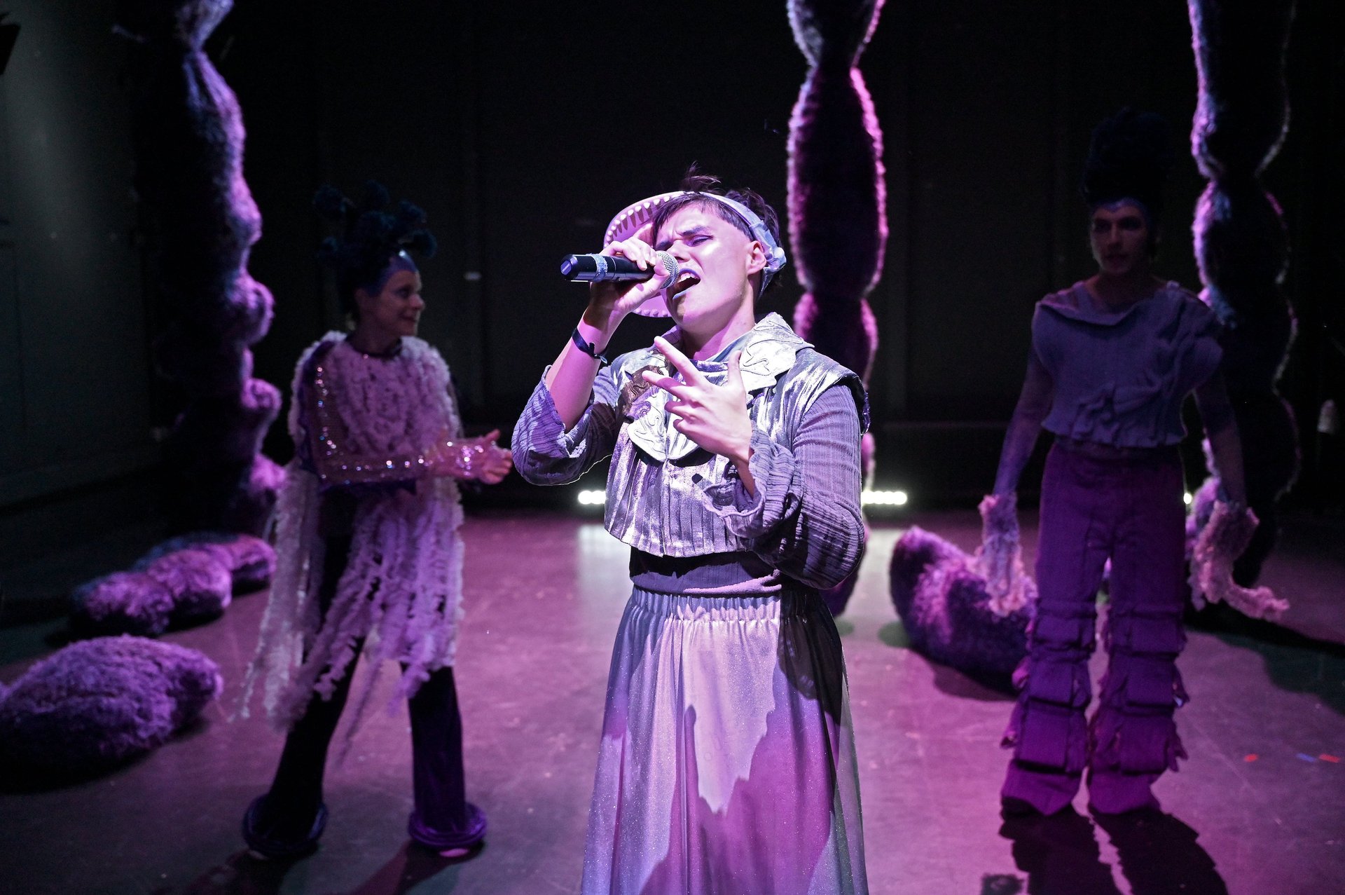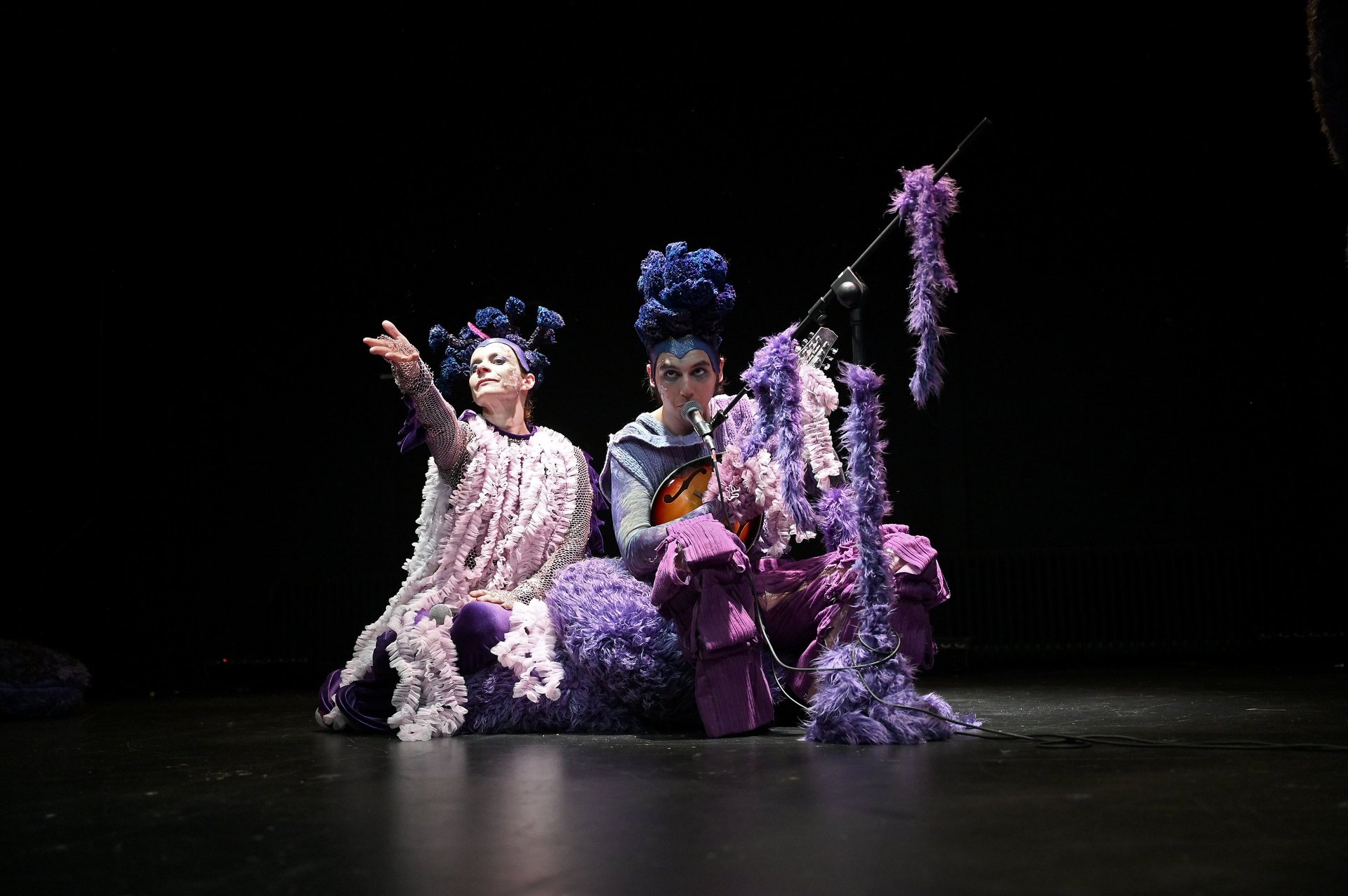 Die Inszenierung von Merle Zurawski zeigt, wie auch die Umwelt des Figurentrios unter dem Einfluss der Menschen leidet: Verschmutzung, Überfischung, Lärmbelästigung. Mit ihrer Parole: „Die wollen Me(eh)r, immer, immer mehr. Wir wollen Me(eh)r, unser Meer zurück!“, sagen sie den Menschen an Land gemeinsam den Kampf an. (…) Neben klassischem Wellenrauschen wird das Publikum in elektronisch selbsterzeugten Tiefseeklängen gewogen. Die herabhängenden und zugleich beweglichen lilafarbenen Plüsch-Tentakel erweisen sich als Multifunktionswaffe: Korallenriff, Nymphen-Felsen, Trennlinie zwischen Wasser und Land.